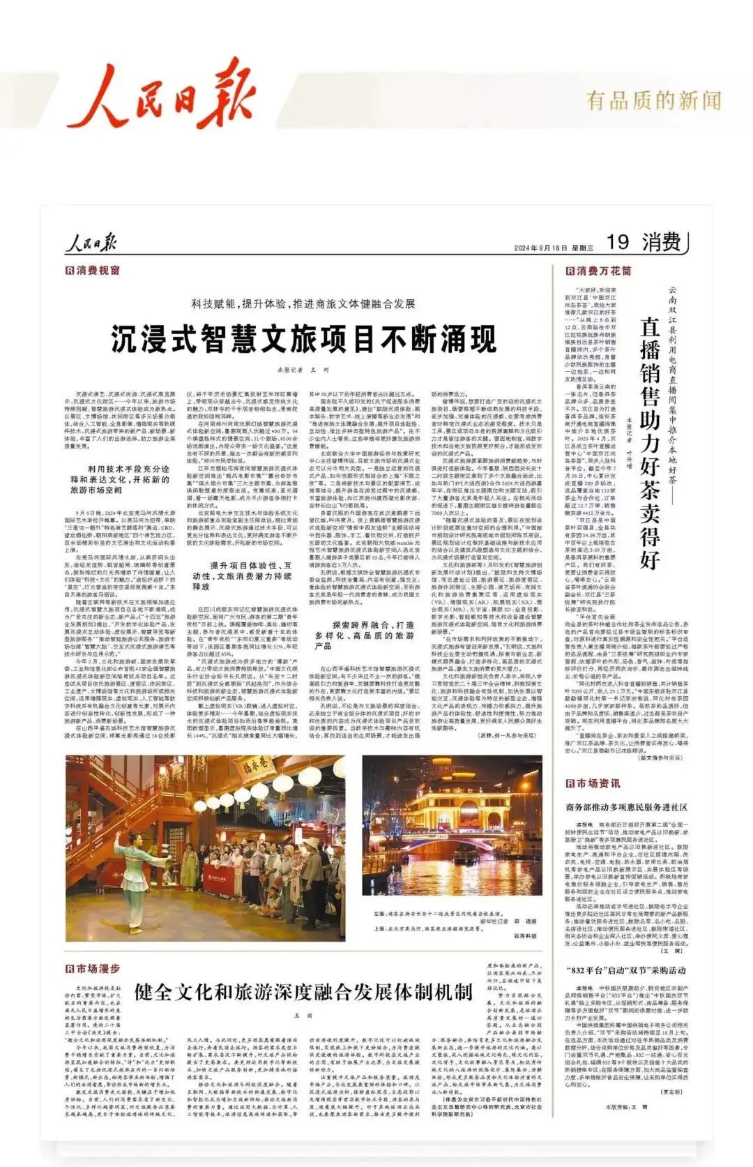 沉浸式演艺、沉浸式夜游、沉浸式展览展示、沉浸式文化街区……今年以来,旅游市场持续回暖,智慧旅游沉浸式体验成为新热点。以景区、文博场馆、休闲街区等多元场景为载体,结合人工智能、全息影像、增强现实等软硬件技术,沉浸式旅游带来的新产品、新场景、新体验,丰富了人们的出游选择,助力旅游业高质量发展。利用技术手段充分诠释和表达文化